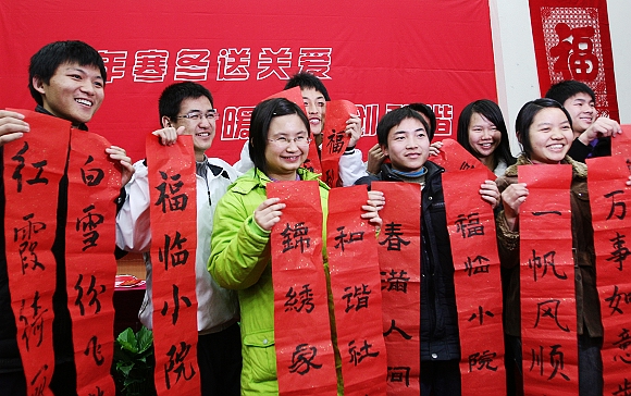 会上,学校领导为学生代表发放了寒假往返路费、慰问品,并向他们赠送了由无阳斋书画社的同学们书写的春联。