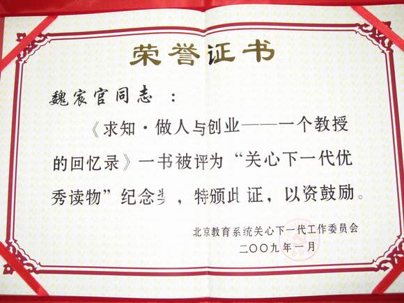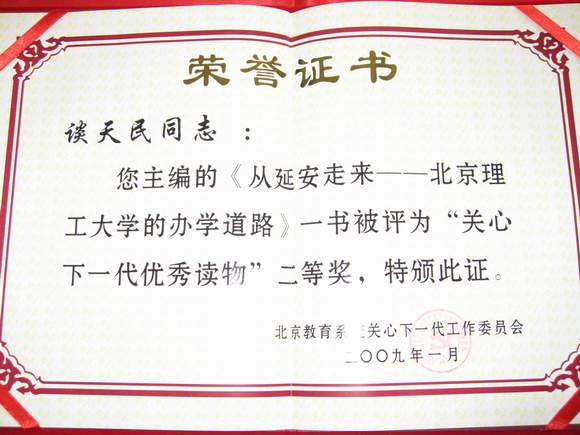 我校退休教师谈天民主编的《从延安走来——德赢AC米兰官网的办学道路》获得“关心下一代优秀读物”二等奖,我校退休教师魏宸官的著作《求知•做人与创业——一个教授的回忆录》获得纪念奖。