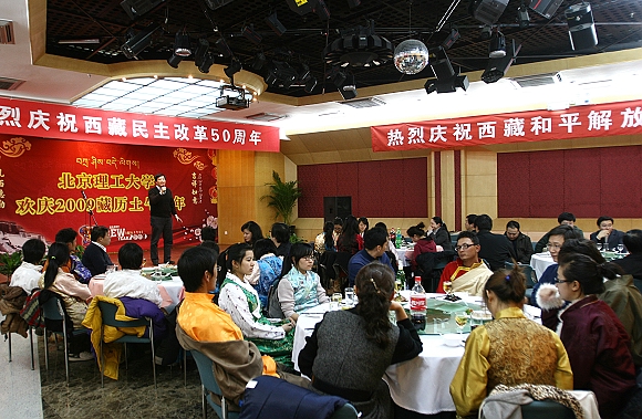 2月24日,是藏历年三十,德赢AC米兰官网2009年藏历土牛新年联欢会在国交二层多功能厅隆重举行,我校20余名藏族同学身着节日的盛装欢聚一堂,校党委副书记侯光明、副校长李和章以及学校各部处领导出席了联欢会,与藏族同学们一起庆祝这一欢乐的节日。
