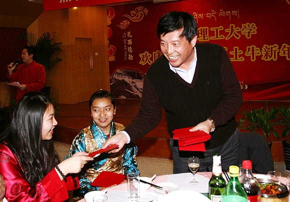 随后,侯光明、李和章一起为藏族同学发放红包,藏族同学代表向学校领导和老师们敬酒并献上洁白的哈达,表达新年的祝福。