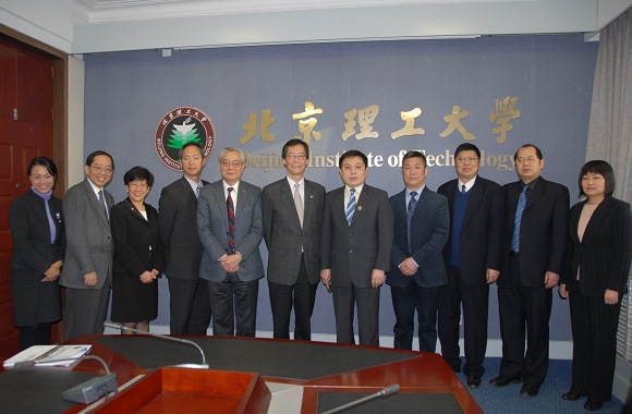 陪同唐伟章校长(左六)一起访问的有副校长高赞明(左五)、协理副校长暨工学院院长卫炳江(左四)、协理副校长暨应用科学系系主任阮曾媛琪(左三)、协理副校长暨医疗科技与资讯系系主任麦福达(左二)以及中国内地事务处处长罗璇(左一)。