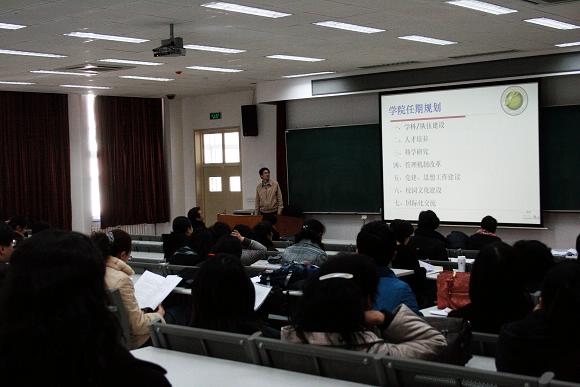 首先,李京廉副院长,谈到了任期规划和本学期主要工作。任期规划方面包括:学科/队伍建设、人才培养、科学研究、管理机制改革与党建、思想工作建设、校园文化建设、国际化交流等。本学期主要工作有:对系部设置进行调整,并进行换届工作;制订津贴改革方案;修订2009版本科教学教学计划等。