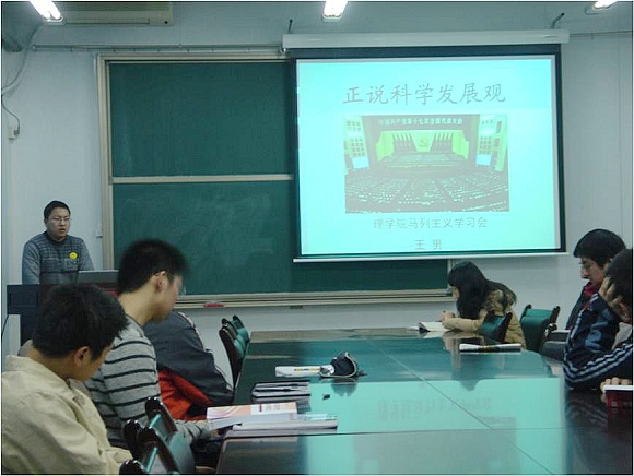 2009年3月14日,理学院马列主义学习会组织学院入党积极分子集中学习了科学发展观基础知识,这也是马列主义学习会本学期的第一次党课。学习会副会长王男以《正说科学发展观》为题,用通俗易懂的语言,贴近生活的问题和实例,向大家介绍了科学发展观的主要组成部分,并引导大家使用科学发展观思考身边的事例。