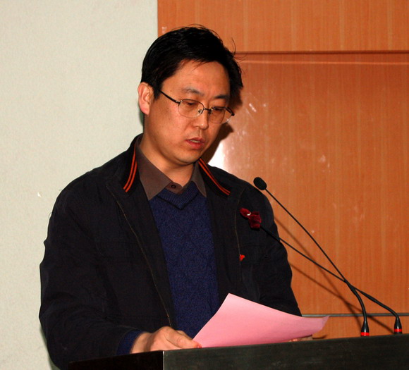 基础教育学院2008级本科生左荣科同学代表获奖学生发言。他针对上学期参加给地震灾区孩子寄贺年卡活动,收到了孩子的回信这件事讲述了切身体会。并表示以后要通过实际行动将爱心和自强自立的精神传播给更多的人。