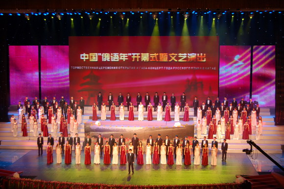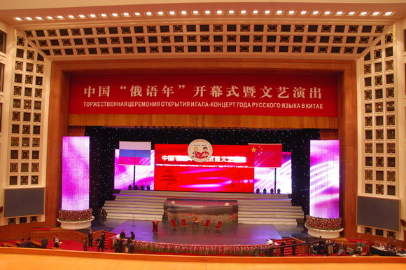 3月27日晚7时30分,由我国教育部和俄罗斯联邦教育署共同主办的中国“俄语年”开幕式在人民大会堂拉开了帷幕,现场悬挂着鲜艳的中俄两国国旗,“中国‘俄语年’开幕式暨文艺演出”的巨型横幅格外醒目。