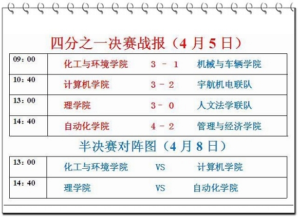 经过一天激烈角逐,化工与环境学院、计算机学院、理学院、自动化学院成功晋级。半决赛将于4月8日进行,由化工与环境学院对阵计算机学院,理学院对阵自动化学院。强强对决,精彩值得期待!