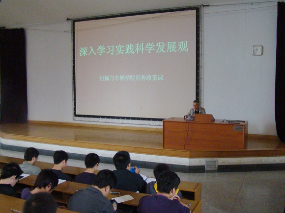 为了深化大学生对科学发展观这一重大战略思想的理解和认识,更好地落实科学发展观进教材、进课堂、进头脑的工作, 4月10日下午,机械与车辆学院分党委书记张英围绕“大学生如何在学习实践科学发展观活动中有所收获”这一主题,为学院本科生带来了一堂精彩的形势政策课。