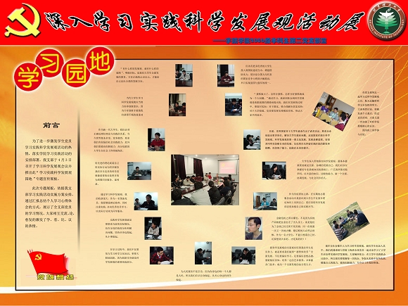 学习实践科学发展观活动第一阶段接近尾声,为了更好的总结第一阶段学习心得和交流体会,宇航学院06级第二党支部的党员设计了展示支部学习的展板,图文并茂。通过第一阶段集中学习和自学相结合的方式,党员们对党的理论尤其是科学发展观有了更深的认识,理论水平有了较大的提高。