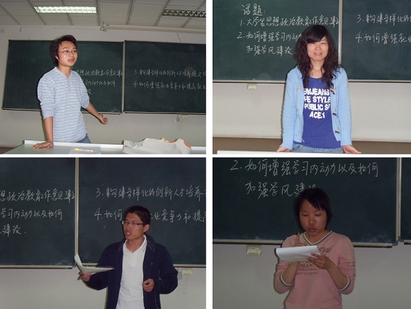 本次讨论会主要针对以下四个话题分组讨论,互相交流思想和体会。1.对大学生思想政治教育工作的意见和建议;2.如何增强学习的动力以及加强学生管理与学风建设,健全学生成才成长的服务体系建设;3.如何构建多样化的创新人才培养模式(创新精神和实践能力);4.如何提高学生的就业率和就业层次;