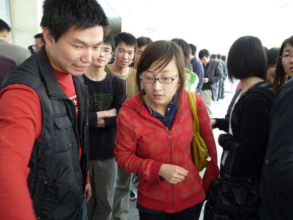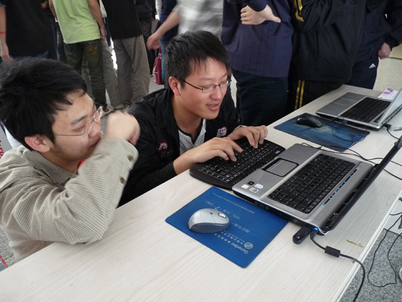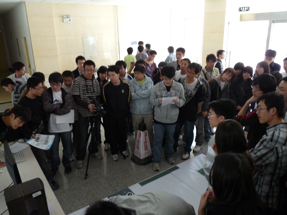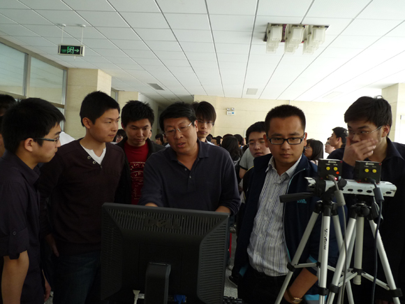 其中,“基于增强现实的广场庆典互动式创意设计系统”展台最为火热,直观逼真的展示方式吸引了众人的眼球,以增强现实实现的广场庆典、北京奥运会开幕式的击缶表演模拟让在场的每位同学都目瞪口呆。同学们一方面惊讶于屏幕上显示的逼真效果,一方面积极向作者询问相关技术及设计思路。由于参赛同学均为软件学院2006级本科生,大家交流起来更加方便、更加顺畅。