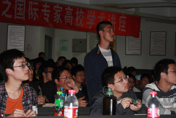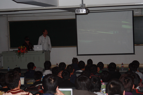 这位法国专家开场时用两句不流利的中文向大家问好,瞬间拉近和同学们的距离,讲座在友好的气氛中拉开了序幕。通过逼真的三维视屏演示和生动活泼的语言,Block先生为大家介绍了欧洲顶尖电影工作室的制作流程、方法以及评判标准。绚丽的效果,前所未有的视听冲击深深地吸引了同学们。