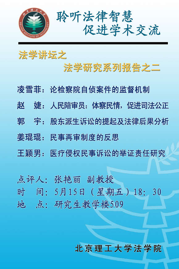 历时一个多月,共分为六个场次的理公明法法学讲坛之研究生报告会,于6月5日顺利闭幕。法学院08级硕士生三十余人先后做研究报告。