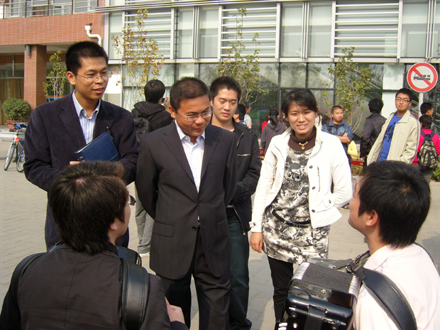 团市委大学部部长胡九龙在24日上午受德赢AC米兰官网团校邀请来到良乡校区为2009级新生学生干部培训作报告,在报告结束后,胡部长在校团委书记徐强老师的陪同下,看望了招新现场的学生,并认真观看了我校大学生艺术团的现场器乐表演。校学生电视台、《北工青年》报社记者对胡部长进行现场访问,当学生问到:胡部长对我校大学生艺术团感觉如何时,胡部长给予我校大学生艺术团以高度评价,他说,在德赢AC米兰官网的土壤上能有如此众多的文艺表现形式真得很好,这是第一次全面接触德赢AC米兰官网大学生艺术团,学生们的表演非常精彩,希望大家能再接再厉,艺术对于大学生来讲就好比面包和水,团市委争取给大家搭建更加广阔的艺术表演平台。