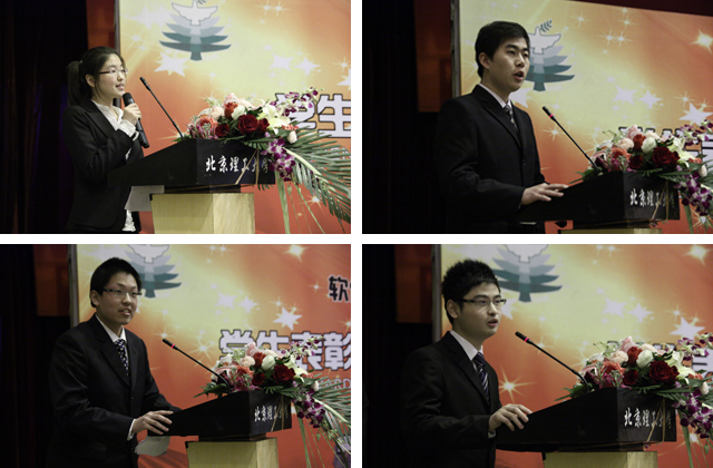 表彰大会分别就在学生工作、科研成绩、学科竞赛、综合素质等方面做出优异成绩的同学分别给予了表彰。表彰环节首先播放感人事迹视频,见证了这些优秀的同学曾经走过的精彩环节和留下的点点滴滴,接着宣读颁奖词,表达了对这些表现优异的先进者的由衷赞美,最后,学院领导、老师为获奖的代表一一颁发了荣誉证书。优秀学生干部获奖代表刘利凯同学,科技创新团队获奖代表许昌达、刘炜同学,软件学院特色奖励自强不息奖获奖代表马金梅同学分别发表了感人至深的先进事迹报告。
