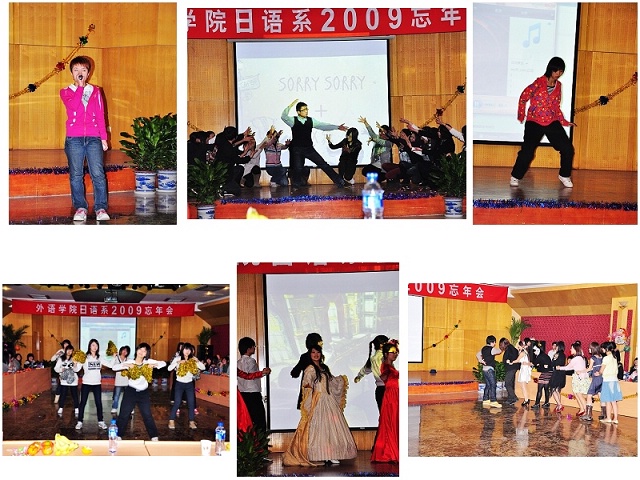 有圣诞老人、有糖果、有彩带、有气球、有礼物,更精彩的是大家精心准备的节目。各年级同学可谓八仙过海各显神通,大一新生个性十足的街舞,活力四射的演唱,向我们展示了日语系90后的精彩。二年级同学为我们带来了一系列的节目,动感活泼的啦啦操表演点燃了会场的热情,沉静灵动的吉他独奏将我们带入了静谧的世界,平实感人的生活剧将大学生活的点滴娓娓道来……大二,果然是大学生活中最丰富的一年。三年级同学自编自导的音乐剧《ever ever after》是本次忘年会的一大亮点。英俊的王子、高贵的公主、活泼的精灵上演了一场险象横生的爱情斗争,配上典雅高贵的宫廷舞蹈、空灵透彻的歌曲,将观众带入了一个浪漫唯美的童话世界。四年级的学长学姐给我们带来了一段动画配音。流利而个性的日语、丰富而出彩的片段,给我们带了一场震撼的视听冲击波,不愧是日语系的元老级人物。