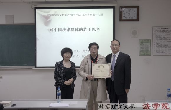 在讲座中,周大伟教授首先以诗性的语言向大家阐述了我国法律职业群体的历史沿革,紧接着周教授从自己多年的旅美经历出发结合自己的切身感受介绍了法律职业群体关系网对我国司法活动的重要影响,并对中国法律职业群体中存在的乱象进行了质疑和重点讲解,周教授认为要解决中国法律职业群体中存在的乱象必须树立坚定的法律信念并从制度和文化两方面着手改进。
