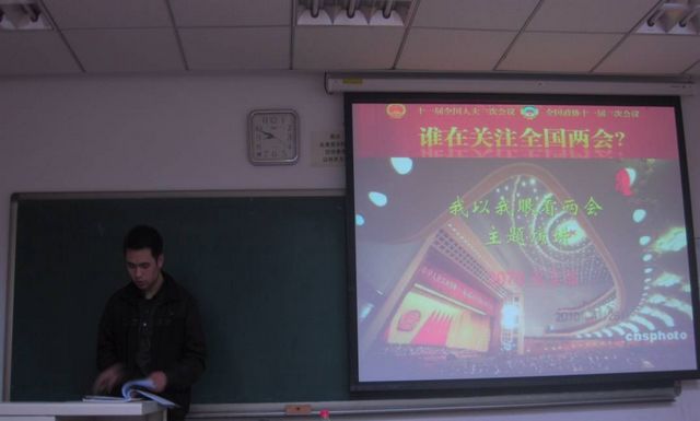 以“我以我眼看两会”主题演讲在5月初开始,同样以支部为单位进行,支部内每个成员结合“两会”内容制作PPT进行主题演讲。其中,3076党支部的党员就哥本哈根气候峰会进行演讲,分析现象成因,倡导低碳生活,提出现在的大学生应该怎样以实际行动保护我们赖以生存的环境。3073支部的曹志涛同学向大家介绍了当今世界现存的法律体系,着重介绍了中国法律体系的形成,从古代的中华法系到当今结合了大陆法系并吸收中国传统法律制度中的优良成分形成的由中国特色的法律体系,让同学们更加清楚的了解中国法律,在社会生活中做一个遵纪守法的公民。