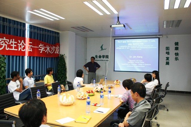 项建华教授首先为老师、同学们介绍Th17及Th17诱导的CTL细胞分别在抗肿瘤免疫、I型糖尿病以及EAE中的作用,具体介绍免疫细胞因子CD4,CD8以及和APC之间相互作用的假说,以及其在自身免疫疾病治疗中的重大意义。