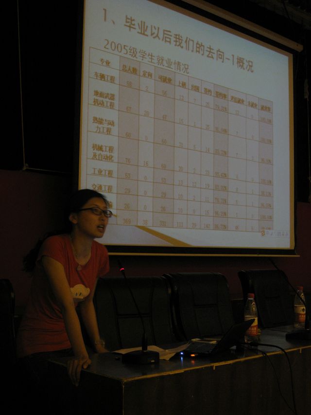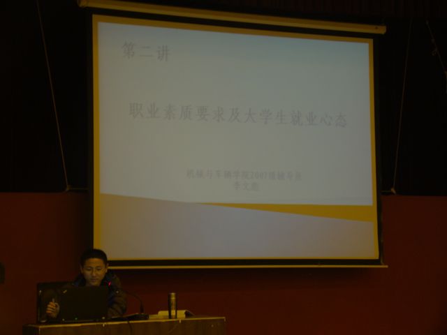 本课程由机械与车辆学院教育教学办公室、分团委牵头组成课程组开设了职业发展规划系列专题讲座,主要面向对象为机械与车辆学院2011年毕业生。此次讲座旨在使学生将个人的职业发展与专业学习、社会实践等培养内容结合起来,树立大学期间的阶段性目标,并结合自己的实际情况进行有目标性的努力。