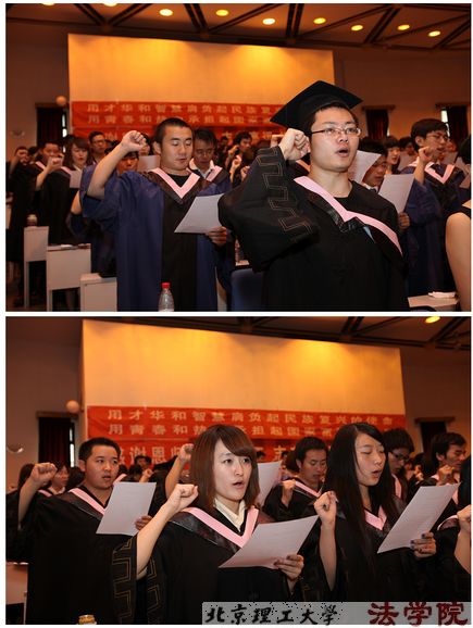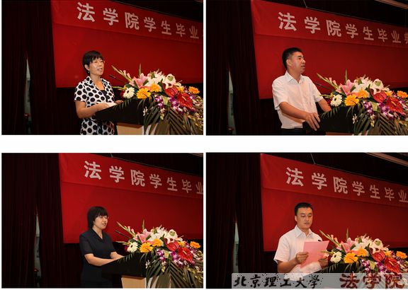 毕业典礼上,教师代表郭德忠老师以“物质化时代的法律人”为题发言,希望毕业生“堂堂正正做人,踏踏实实做事”,并祝贺毕业生圆满完成学业;优秀校友代表96级毕业生、现任 百泰酒业副总裁刘巍发言,表达了对母校的深深怀念和对学弟学妹们的真挚祝福;本科毕业生代表舒歆同学发言,表达了全体毕业生对学校领导和老师的感激之情和崇高敬意;研究生毕业生代表姜琨琨发言,表达了对母校的留恋和对同窗未来的祝愿,并带领全体毕业生宣誓,“传承谦虚谨慎、自强不息的理工传统;发扬团结勤奋、求实创新的理工精神;志存高远,锐意创新;勤勉做事,谦虚为人。用才华和智慧肩负起民族复兴的使命;用青春和热血承担起国家富强的责任。”的豪言壮语在报告厅中回响。