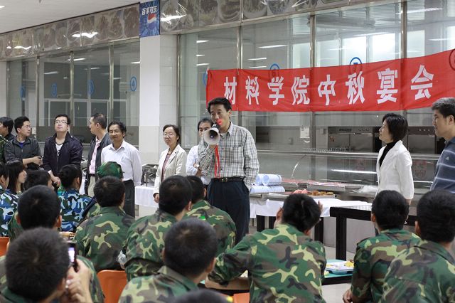 9月21日晚,材料学院2010级新生迎中秋团圆宴在良乡校区南区食堂二层隆重举行。材料学院分党委书记王鲁教授、副院长曹传宝教授、副院长李树奎教授、副书记副院长韩笑老师、材料化学系主任冯增国教授、材料加工系主任马壮教授、高分子系书记李晓萌教授、金属系书记朱时珍教授、新生辅导员及班主任、学院军训带队干部和学院全体2010级本科新生参加了宴会。