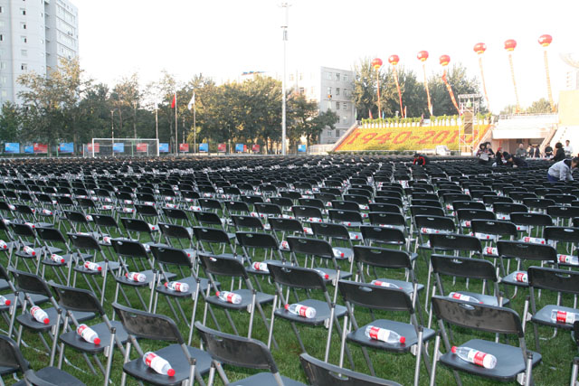 物业服务管理中心在本次校庆活动中承担着艰巨的主会场布置工作。9月24日晚十点,当整个校园渐渐归于宁静,我们物业的员工才开始冲洗校园的每一条街道,默默地工作直至零晨1:30。9月25日清晨,又是我们物业的员工,伴着朝阳出现在即将举行校庆庆典的操场上,这里有11000余把椅子等着他们来摆放。