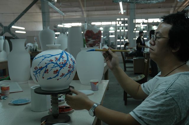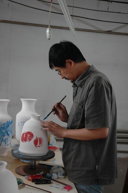 不用传统的宣纸,也放下一般的毛笔和墨汁,在光滑的瓷瓶弧面上写写画画,需要静气,需要把握用笔力度,需要对器型进行全方位整体设计。艺术家们在瓷器上挥洒诗情画意,着实是一件让人眼界顿开的事。