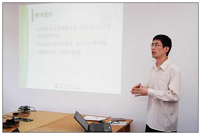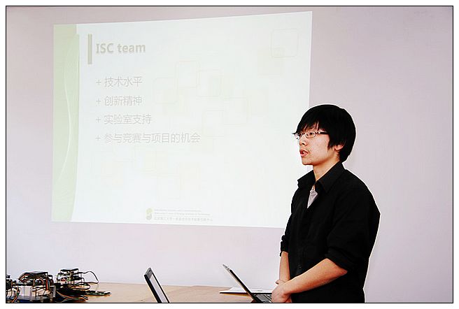 ISC团队总体负责人马兆远同学展示了ISC团队在各项学科竞赛中的获奖作品以及团队成员在大学生创新计划(NSRIT)中所取得的成果。 在2008年、2010年两届全国大学生电子设计大赛信息安全与对抗技术邀请赛上,ISC团队共取得全国一等奖1项、全国二等奖2项、全国三等奖3项。