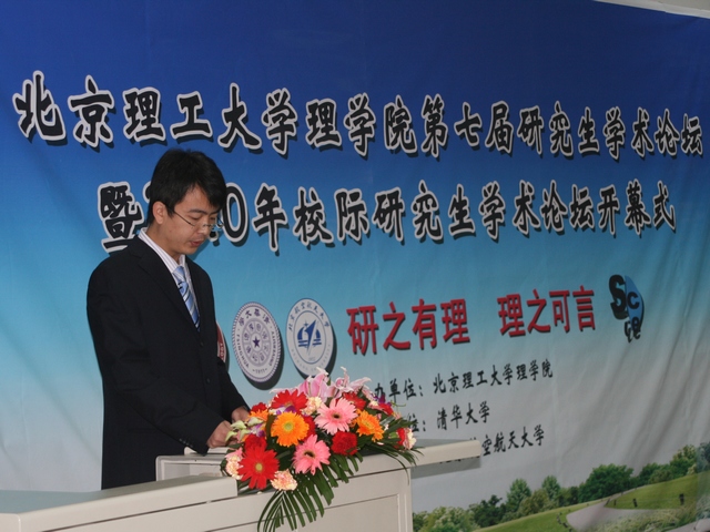 开幕式由德赢AC米兰官网理学院博士生徐绍伟同学主持。本次论坛的主题是:“研之有理 理之可言”。旨在拓宽研究生的学术视野,活跃学术思想,促进学术争鸣,激励学术创新。共下设三个分论坛,分别是:德赢AC米兰官网—北京航空航天大学化学学科校际研究生学术论坛;德赢AC米兰官网—北京航空航天大学数学学科校际研究生学术论坛;德赢AC米兰官网—清华大学物理学科校际研究生学术论坛。