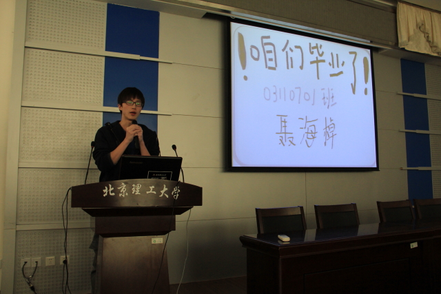 在答辩过程中,聂海棹同学说“进校时,我的简历上还只有名字和星座,通过四年的努力,我已将我的简历充实得满满的,每一条都是我自己亲力躬行的”;郭阳同学将自己成绩进步的数据进行对比,并在最后饱含深情的说“别了,北理工;别了,我的青春”;王文超同学追求的纽约梦;王若婷同学所说的“最大学”;高峰同学表达的对班级、对学校的怀念;董路宁同学的拾贝,这些都引起了同学们的共鸣,获得了理解与鼓励的掌声。