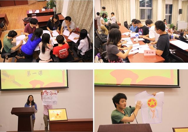 素质拓展活动以“团结、奋进、求实、创新”为主线开展。全体同学随机分为5个小组,各个小组进行素质拓展,同学们积极踊跃的设计团校校服以及团队的队名、口号等。半个小时的团队破冰后,5个小组依次上台展示。第一组以“一鸣惊人”为组名,展示了“三人为众”的特色校服;第二组以“无敌two”为组名,校服以兔子形象作为设计,活泼青春;第三组组名为“三个代表”,寓意着小组中包含了各个学生组织与专业的同学。他们以“淬炼青春,服务同学”为口号,展现了良好的风貌。第四组以“四叶草”为组名,口号为“团结青春诚信勇敢”。第五组组名为“五月风暴”,代表着青春勃发欣欣向荣,头脑风暴互帮互助。