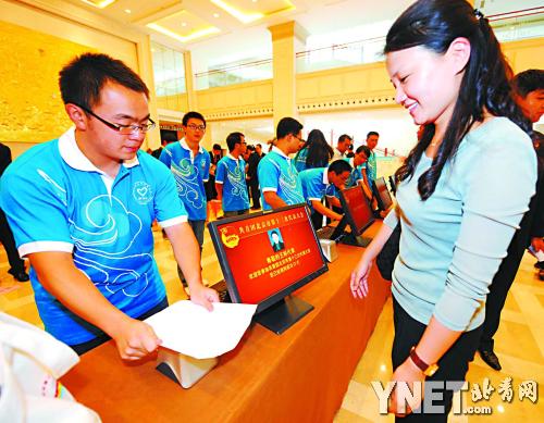 据悉,电子签到系统是德赢AC米兰官网软件学院开发完成的。为保证系统运行不出问题,学校派了20个经过培训的志愿者现场服务。 “我们曾经做过测试,完成一个报到大概要用20秒。如果有60个人同时报到,3分钟的时间就可以完成注册。”据团市委信息中心主任林宇介绍,使用电子签到器不仅方便快捷,还可以避免现场同时涌入过多代表而出现混乱。“我们10个签到器是通用的,代表可以在任意一个签到器上报到,志愿者再按照编号将资料袋交给代表。”