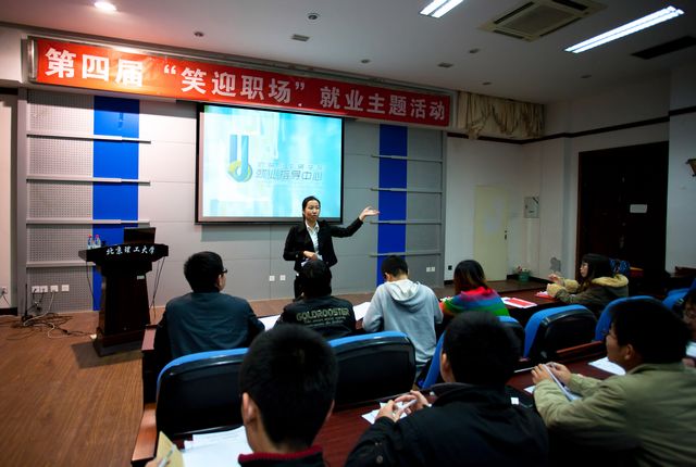 11月7日晚19:00,第四届“笑迎职场”系列活动在中关村校区车辆实验楼二层报告厅拉开帷幕,系列活动的第一场“简历诊断坊—Mini workshop”顺利举行。第四届“笑迎职场”就业指导系列活动共设五个不同主题,将通过简历诊断、2012届毕业生就业情况总结分享、留学辅导、职业规划及面试技巧辅导等不同形式全方位的为广大毕业生的就业难点和问题提供有针对性的指导及服务。本次活动邀请了BeBeyond Career Workshop的资深培训师李子珑为大家进行简历分析及讲解,共有40多名同学参与了现场活动。