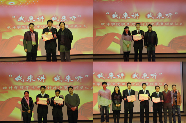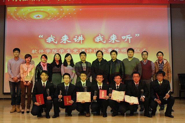 软件学院2012年“我来讲,我来听”学生党课评比大赛到了此刻暂时落下了帷幕,青年学生的思想教育和思想引领却一刻也不能停下脚步,我们还有漫长的一段路程需要去探索。软件学院学生党课评比大赛,将作为软件学院长效化、机制化的一项思想教育工作来开展,不断累积经验,借鉴好的方法,力争将学生党课评比大赛做成软件学院精品党课活动,做成软件学院特色思政教育活动。我们始终坚持学生科技创新和学生思想教育“齐步走”,相互支撑、相互促进。努力培养出更多优秀的软件学子,为国家的信息化建设做出更大的贡献,为祖国的明天奉献自己的青春。