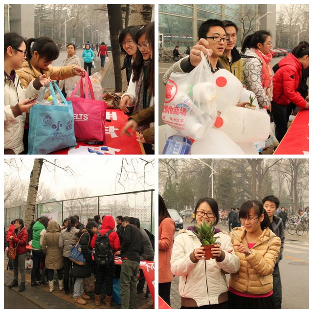 尽管天空下着小雨,依然没有浇灭师生参与的热情。大家自觉地排起了长队,前来登记换盆栽的同学络绎不绝。芦荟、仙人球、彩色仙人掌、观音莲、开花竹等多个品种的近百盆绿植在不到一个小时的时间里就被热情洋溢的师生们全部换完。本次活动共回收废旧塑料瓶、易拉罐3000余个。