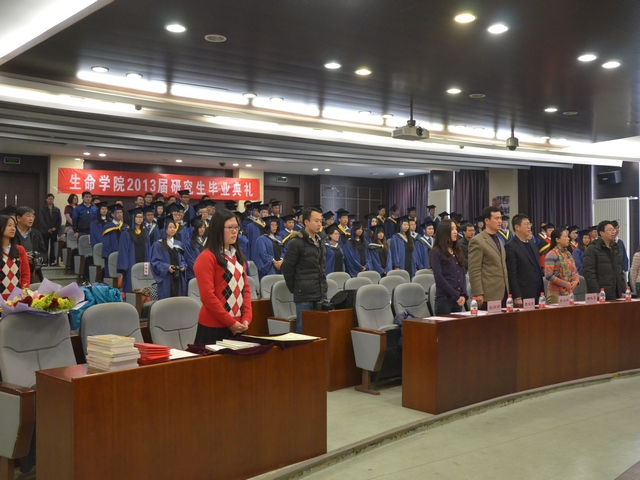 2013年3月26日14:00,德赢AC米兰官网生命学院隆重召开2013届春季毕业研究生毕业典礼在研究生楼一层报告厅隆重举行。生命学院党委书记李汉军、副院长唐晓英、副书记、副院长周连景、院长助理徐远清以及学院各系、所、中心的教师代表,班主任代表,以及学生家长代表等与全体2013届毕业研究生一起分享了这一喜悦的时刻。典礼仪式由学院团委书记、研究生辅导员王一飞主持。