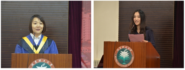 2010级毕业生刘莲代表全体毕业生发言,回顾大学生活,展望新的人生阶段,并对学校、学院和老师们的辛勤培育表示了衷心感谢;教师代表生物医学工程系副教授陈端端老师对毕业生们表示祝贺,并对同学们今后的发展提出的殷切的希望。