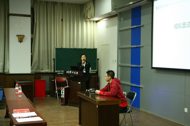 此次活动由面试指导、模拟面试以及现场互动三个部分组成。在面试指导环节,李老师为同学们剖析了面试的基本流程及重点部分,并通过生动的实例讲解帮助同学们学会认识、辨别面试常见问题和误区,更为同学们分享了面试时的正确心态—积极自信是最重要的筹码。