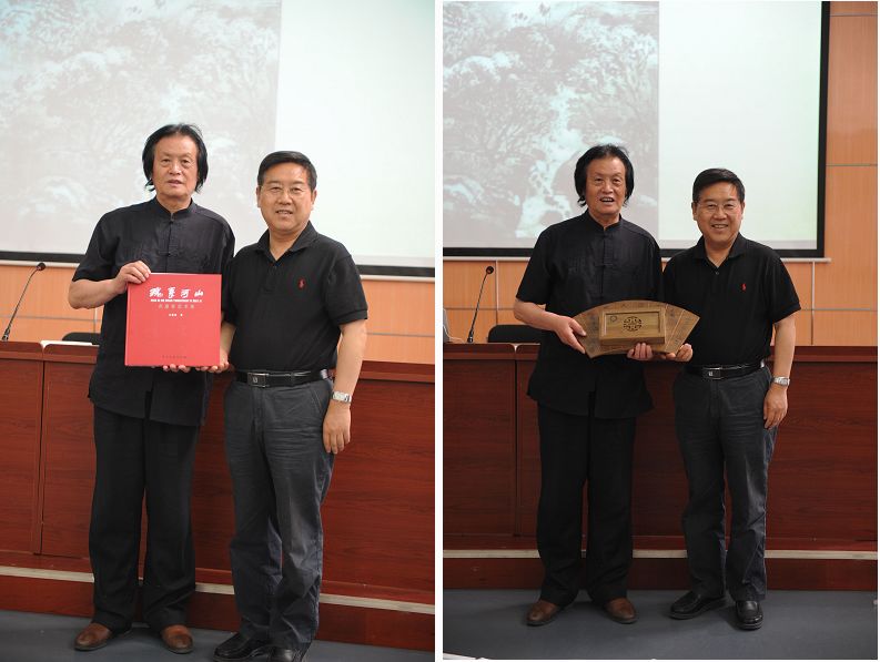 讲座结束后衣先生向人文学院赠送书法作品,张红峻书记代表人文学院回赠礼物,表达感谢和敬意。