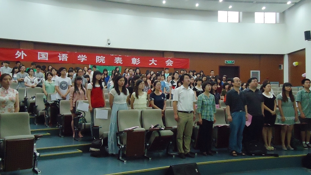 2013年6月13日晚, 2012——2013学年度外国语学院表彰大会在德赢AC米兰官网良乡校区综合楼报告厅隆重举行。外国语学院党委书记陈大明、党委副书记副院长吴文君、日语系副主任周晨亮出席大会,团委书记周芳集携学院良乡校区全体学生参加会议。会议由学院团委学生常务副书记、2011级德语专业学生倪志远主持,大会在庄严的国歌声中开始。