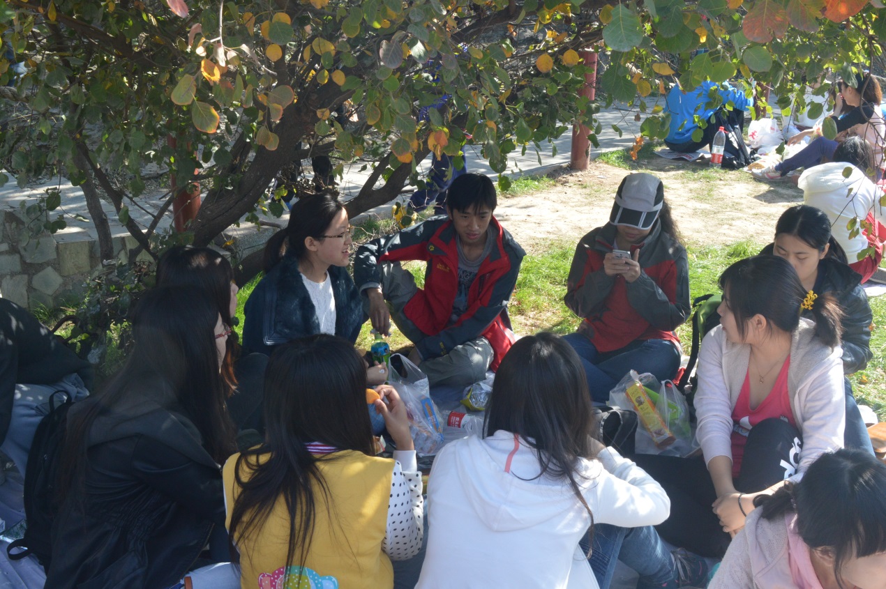 突破了登山的重重关卡后,大家都顺利到达山顶,吃零食休整,谈笑风生。