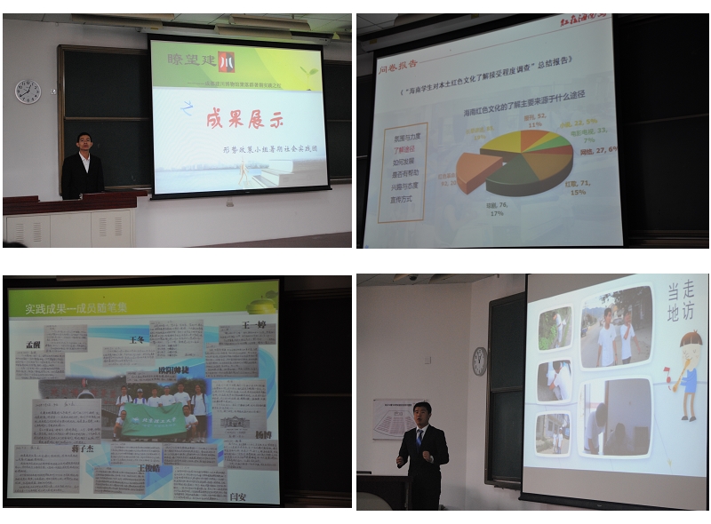 在本次大会上,机械学部4支暑期社会实践优秀团队首先上台做了成果展示。展示过程中,“历史、感动、中国梦”实践团在建川博物馆的所见所感、赴大别山关爱留守儿童团队的深邃思考、海南红色文化团队在海南省文化艺术各界的广泛调研、汶川地区经济文化调查团的缜密分析让现场同学不仅跟随他们重温了暑期实践的难忘历程,而且受益匪浅。同学们精彩的PPT制作、流利的语言表达、清晰的数据分析体现出了优秀暑期实践团队的用心与专注,给现场同学做了很好的榜样示范。