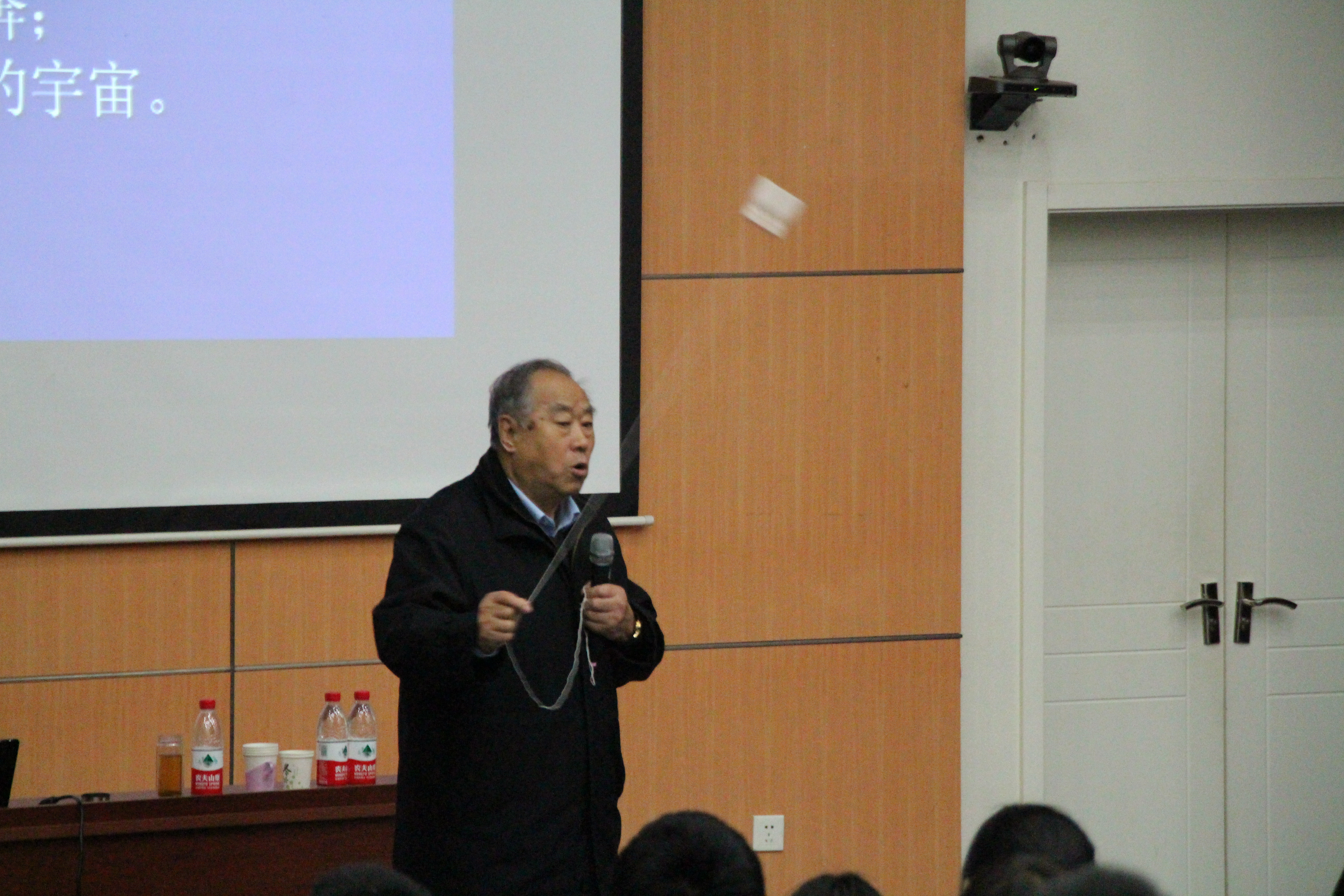 已过古稀之年的张厚英研究员,由美国先进的航天卫星拍摄技术入题开始了当天的报告会,他介绍了我国航天技术发展的紧迫性、艰巨性,与同学们分享了中国航天工作者牺牲与奉献的感人事迹,用生动的事例告诉同学们信仰的力量。讲座做成中,他还通过10个关于月球的问题与同学们展开互动,拿出道具模拟飞船脱离地球的过程,与同学们探讨相关专业趣味问题,赢得了同学们的积极响应与掌声。