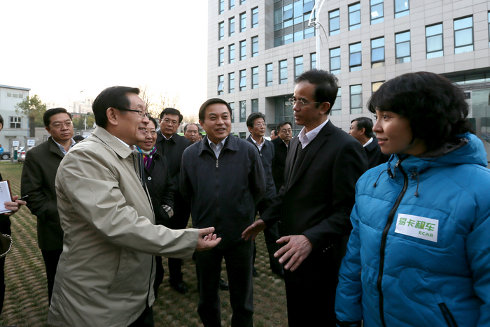 下午16时许,万钢副主席一行驱车来到我校,我校校长胡海岩院士、副校长孙逢春陪同万钢一行参观调研了我校新能源汽车租赁站情况。万钢副主席肯定了我校在新能源汽车研发、电动车租赁业务方面所做的工作。在调研中,万钢副主席看到大部分停在充电桩前整齐停放的电动汽车时,颇为关注地询问目前电动汽车的出租率,当听北京市科委主任闫傲霜介绍说目前大部分车辆主要采用长租形式,这批车辆的主要用户是德赢AC米兰官网的教师,车辆主要是上下班代步使用,所以白天多数停在充电桩前补电时,万钢副主席指出要利用北理工在校师生这股年轻群体的探索精神,配合纯电动车这种新颖、新奇的事物,产生更好的推广效果。
