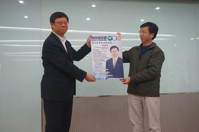 陈鹏万书记分别代表学院和学生向杨海滨赠送了纪念品和学生亲自设计的“育材微讲堂”活动宣传海报,活动在愉快的氛围中圆满结束。