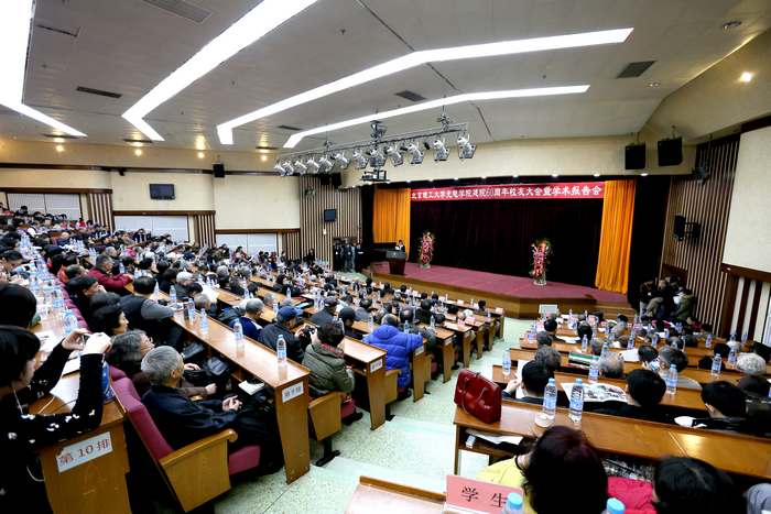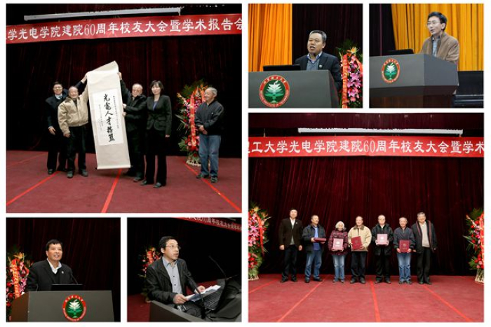 岁月如歌,六十载春华秋实;盛世相约,喜满园桃李芬芳。2013年12月7日上午9点,近500名校友欢聚一堂,参加在中心教学楼一层报告厅举行的“光电学院建院60周年校友大会暨学术报告会”。大会由学院院长薛唯教授主持,学校党委书记郭大成教授出席会议并讲话,对外工作委员会主任、原校党委书记焦文俊教授等光电校友应邀参加,20多个兄弟院校和研究院所发来贺信。