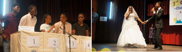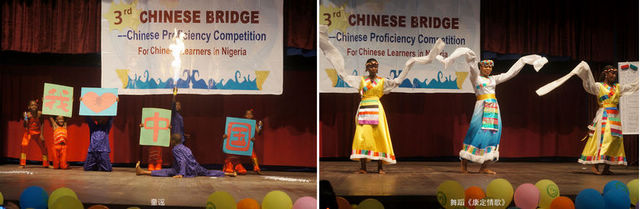 本届“汉语桥”比赛设有中文知识竞答、中文歌曲演唱和中国舞蹈表演三个比赛项目。在中文知识竞答部分,尼日利亚学生对答如流。歌曲和舞蹈部分精彩纷呈。从小学生可爱的童谣到大学生激情澎湃的民歌,到耳熟能详的流行歌曲,尼日利亚汉语学习者创新演绎;参赛者还穿起长袖藏族舞衣,跳起了《康定情歌》。