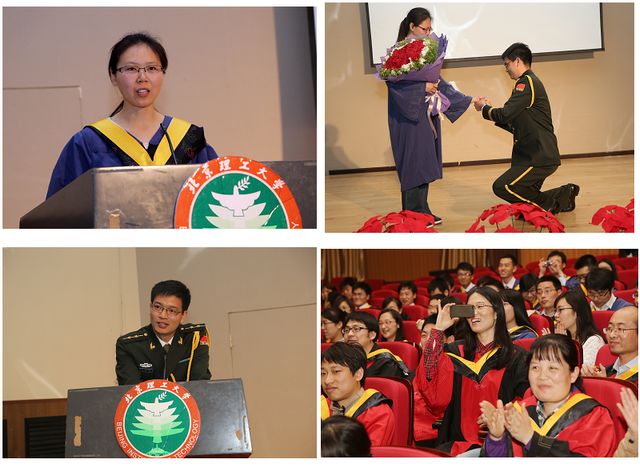 杨秋榕同学代表毕业生发言,她动情地讲述了在材料学院难忘的青春回忆,表达了对母校的感激与不舍。她表示,不管将来身处何地,都将牢记北理学子的荣誉和责任,做一等的人杰、创一等的事业、守一等的品格。在发言结束之时,与杨同学相恋多年的何旭道同学快步走到台上向她求婚,在场所有老师和同学们无不为之动容,纷纷祝愿两人生活美满,一生幸福,把毕业典礼的气氛推向了高潮。