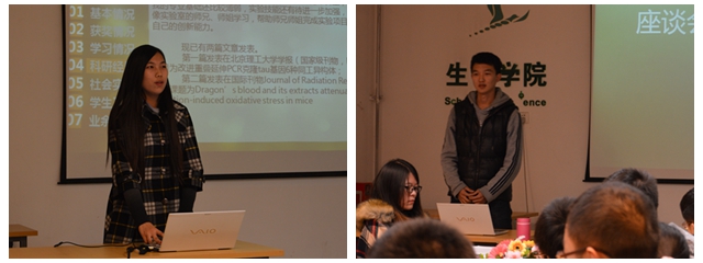 2014年11月17日晚7点,生命学院共学会在5号楼712会议室举办2014生命学院“党员榜样 充分发挥党员先锋模范作用”座谈会。此次活动旨在激励各入党积极分子向优秀党员学习,树立榜样,并在生活中起到先锋模范作用。生命学院11级优秀本科生党员张行健、董一名应邀出席此次座谈会。座谈会由生命学院辅导员李恒月主持。