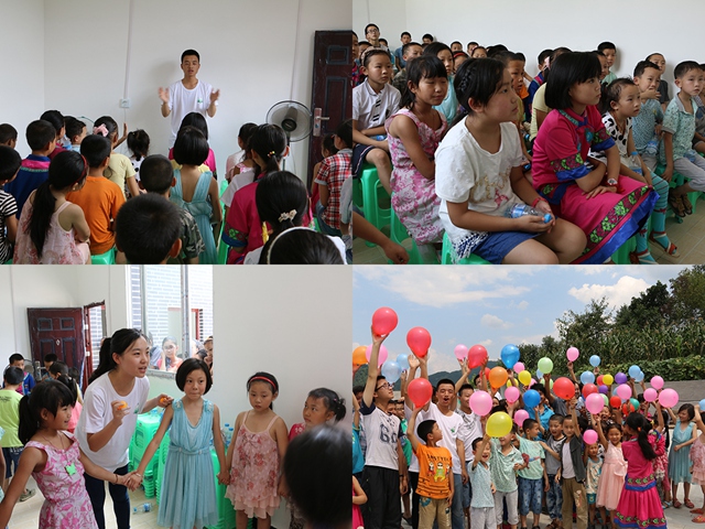 爱的延伸:7月28日实践团携手凉水井社区主任、达州广播电视大学副校长叶军老师、市民宗局领导等一同赶往樊哙镇,为该村80余名留守儿童开展爱的延伸系列活动。“公道杯”、“神奇的良心壶”、“倒立的杯子能装水”等一个个简单易懂、生动有趣的小实验,深深地打动着山里孩子的好奇心。为加强与孩子们的互动交流,志愿者还准备了“点将传球”、“爱的抱抱”、“梦想寄语”、“放飞梦想”等互动游戏和趣味活动。活动结束,孩子们走出教室,来到高伦村委的院坝里,仰望天空,在老师们“一、二、三”的坚定节奏中,放飞手里的气球,放飞自己的梦想……参加本次活动的达州电大副校长叶军说,此次活动拓展了达州继续教育“项目+课程+志愿者”新模式的体现,也是深入开展精准扶贫智力扶贫工作的重要内容。高伦村支部书记宋德中表示,此次活动让孩子们开阔了眼界,拓展了视野,增添了前进的动力。今后,他们将利用村委闲置活动场所,通过达州继续教育平台征集志愿者,在寒暑假免费为留守孩子上课,达到“教育一个学生,带动一个家庭,改变整个村庄”的效果。